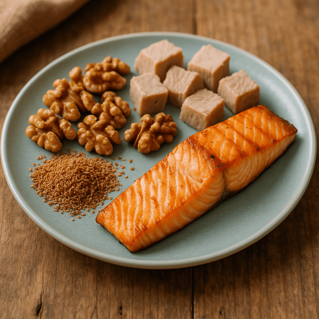 The most well known and common sources of Omega­-3, a healthy fat, are fishes like salmon and tuna as well as seafood like prawns and scallops. You might be surprised to find that the lesser­ known walnuts and flaxseed are also rich in Omega­-3.