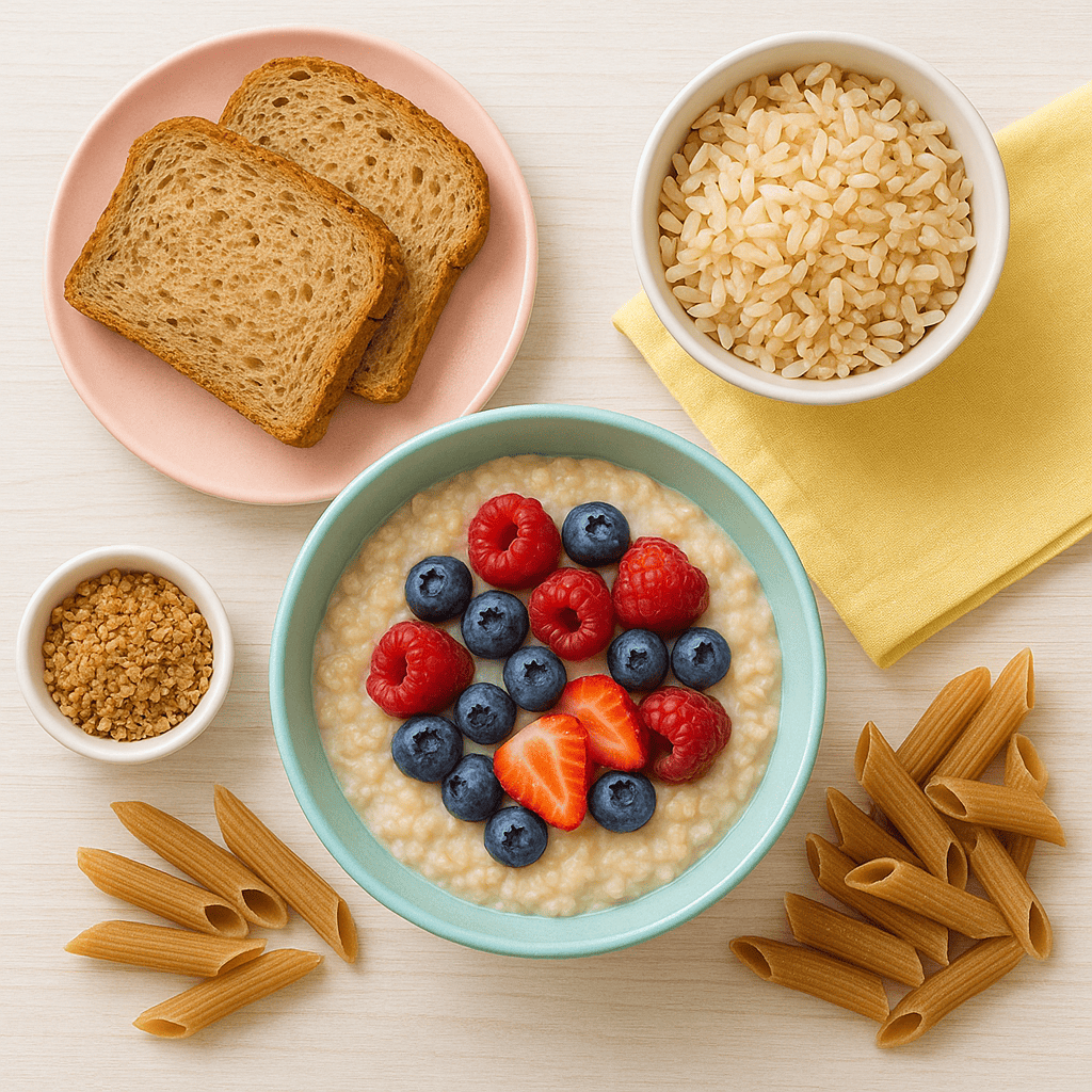 Complex carbohydrates like pastas, brown rice, oatmeal, whole­grain bread and cereals.
